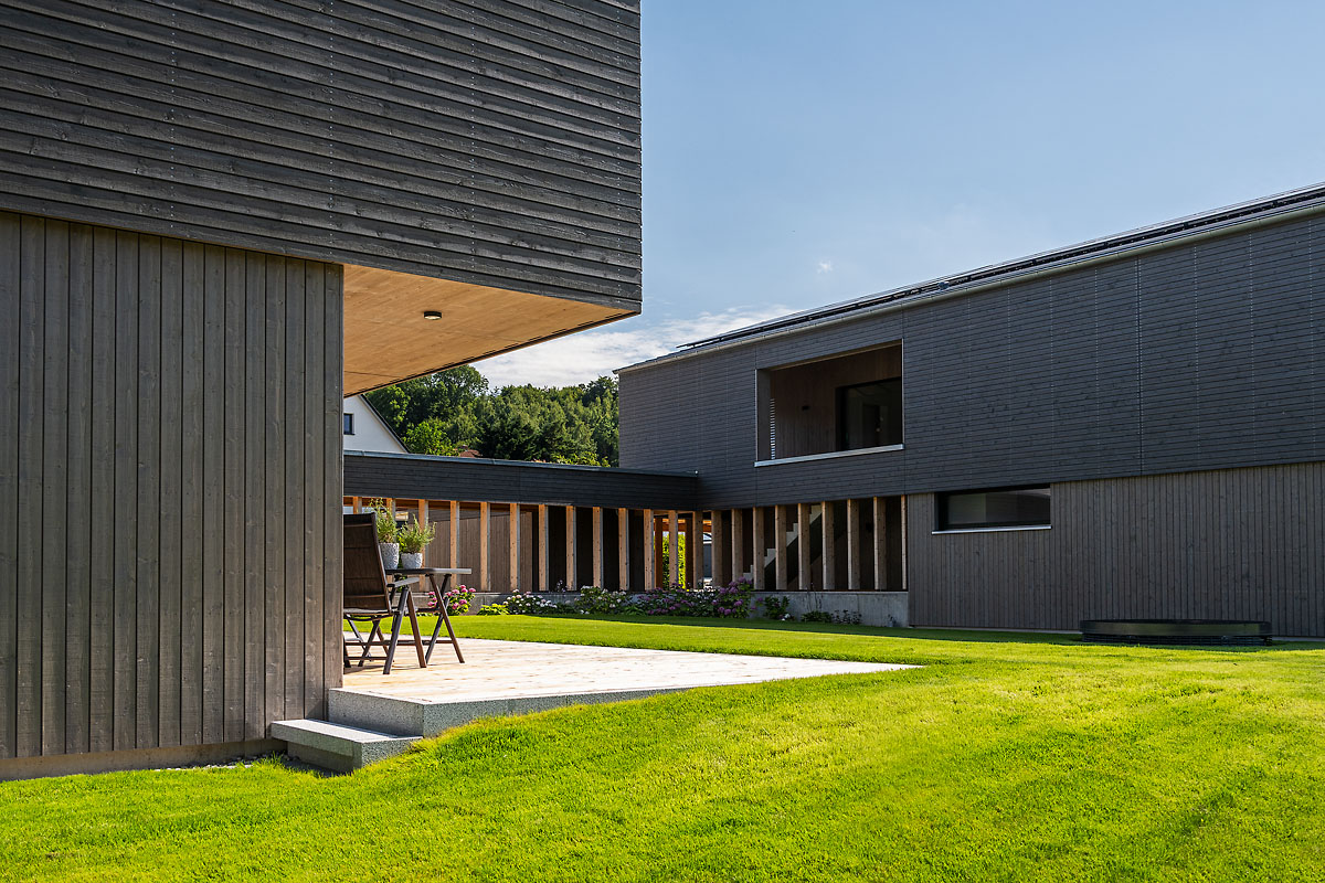 Das dreigeschossige Gebäude sitzt mit dem Sockelgeschoss zur Hälfte im Hang, wobei das Untergeschoss als Stahlbeton Massivbau und die oberen Geschosse als Holzbau erstellt wurden. Durch große Öffnungsflügel über die gesamte Gebäudelänge kann man den gesamten Wohnraum zur Dachterrasse hin öffnen. Für die Fassade wurden Bretterschindeln eigens angefertigt. Die Außenwände wurden in Holzrahmen- und die Innenwände in Brettsperrholzbauweise ausgeführt.